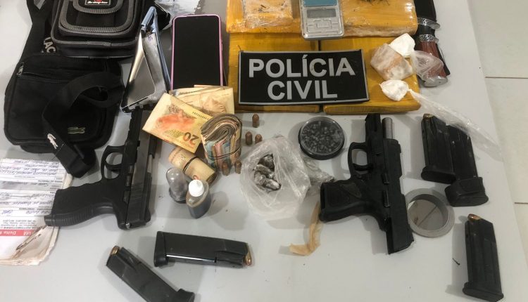 Durante a operação na residência do suspeito, os policiais apreenderam duas pistolas, carregadores, munições, grande quantidade de drogas (maconha, crack e cocaína), uma balança de precisão e uma quantia em dinheiro. No local, um segundo suspeito também foi preso.