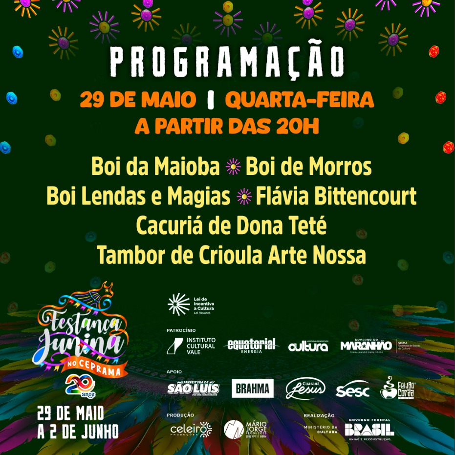 Nesta quarta-feira (29), a abertura será com Boi de Morros, o batalhão pesado do Bumba Meu Boi da Maioba (sotaque de matraca), o show da cantora maranhense Flávia Bittencourt, Boi Lendas e Magias, Cacuriá de Dona Teté e o grupo de Tambor de Crioula Arte Nossa.