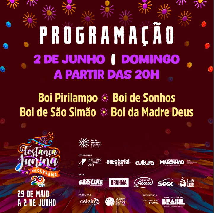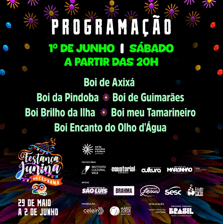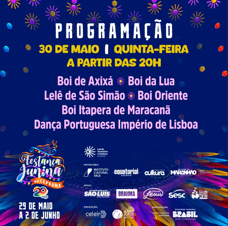 A 20ª edição da Festança Junina no Ceprama vai até o domingo (2 de junho) com entrada gratuita. O evento é realizado, tradicionalmente, no final do mês de maio e conta com apoio do Governo do Maranhão por meio das Secretarias de Estado da Cultura (Secma) e do Turismo (Setur-MA).