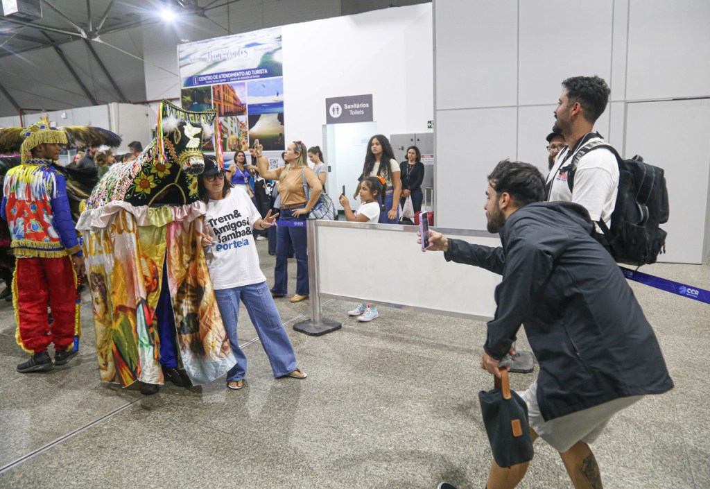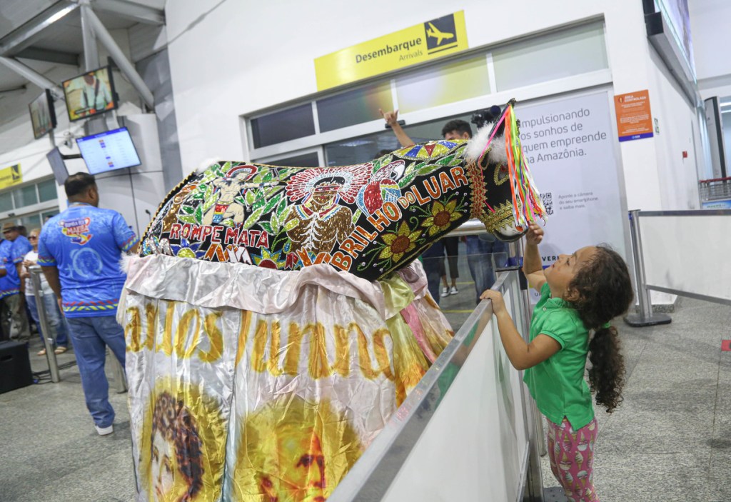 A apresentação do Bumba Meu Boi da Maioba no saguão de desembarque atraiu a curiosidade e o entusiasmo de quem estava no aeroporto. Além da recepção calorosa com os ritmos maranhenses, os visitantes receberam matracas como lembrança.