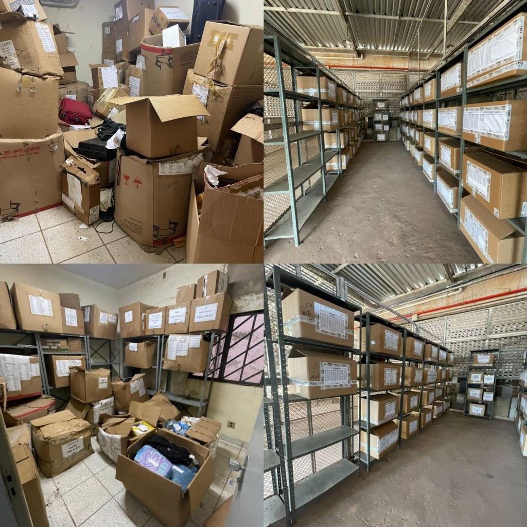 O depósito judicial registra os materiais armazenados através dos números de autos e processos. Entre os itens estão celulares, TVs, balanças de precisão, tablets, bolsas, colares, pulseiras e outros eletrônicos.