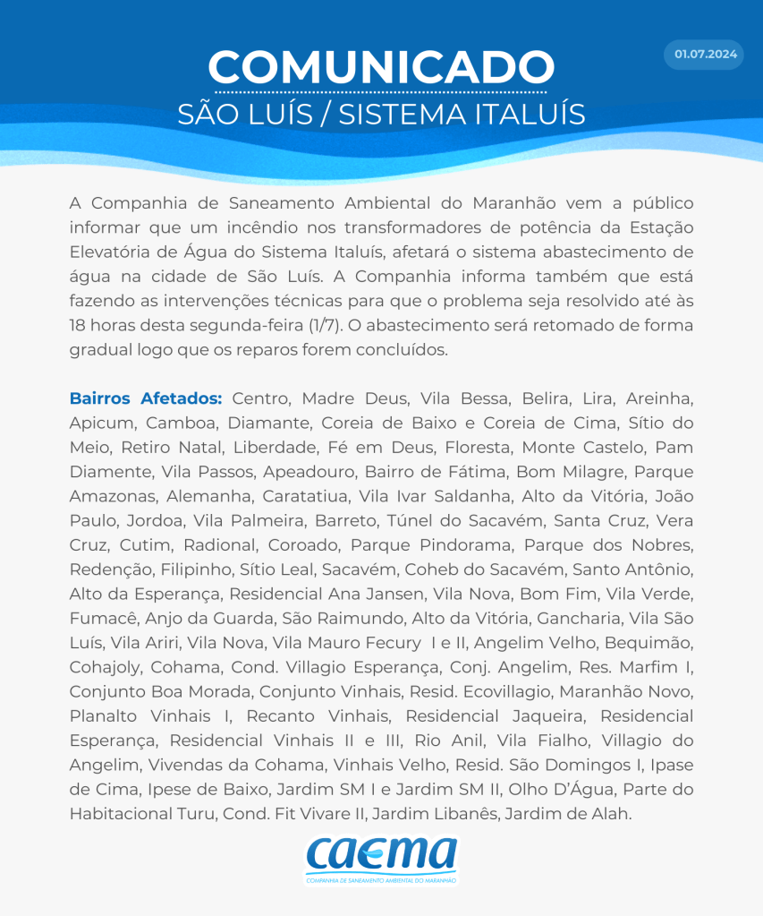 Um incêndio nos transformadores de potência da Estação Elevatória de Água do Sistema Italuis comprometeu o abastecimento de água em São Luís. A Companhia de Saneamento Ambiental do Maranhão (CAEMA) informou que equipes técnicas estão trabalhando para resolver o problema até as 18 horas desta segunda-feira (1/7). O abastecimento será retomado gradualmente após a conclusão dos reparos.