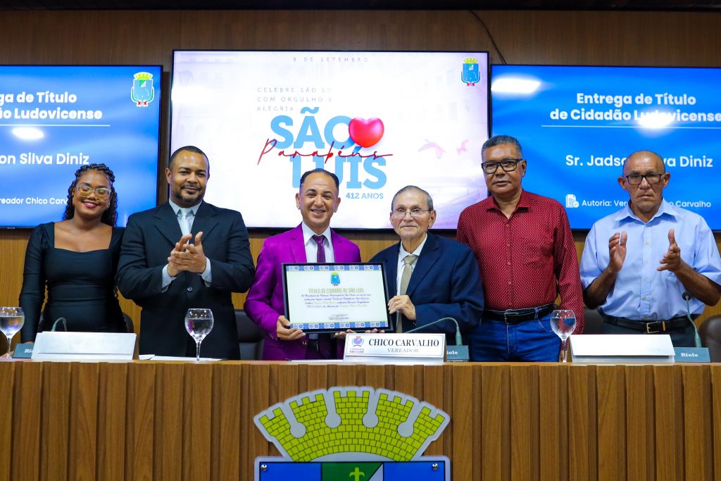 A Câmara Municipal de São Luís concedeu, em sessão solene na tarde desta quarta-feira (4), o Título de Cidadão Ludovicense a Jadson Silva Diniz, por suas relevantes contribuições à área da cultura na capital maranhense.