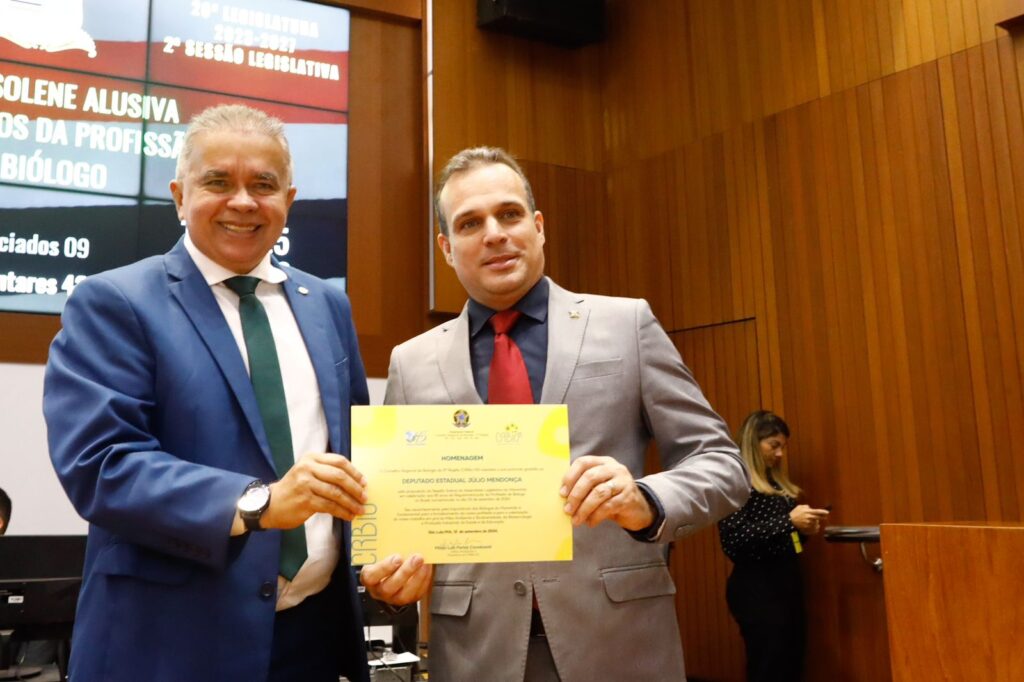 O biólogo Mário Luiz Farias Cavalcanti, presidente do Conselho Regional de Biologia – 5ª Região, homenageou o deputado Júlio Mendonça, em reconhecimento a proposta da sessão solene e respeito à profissão. A homenagem foi estendida a vários biólogos renomados do Estado.