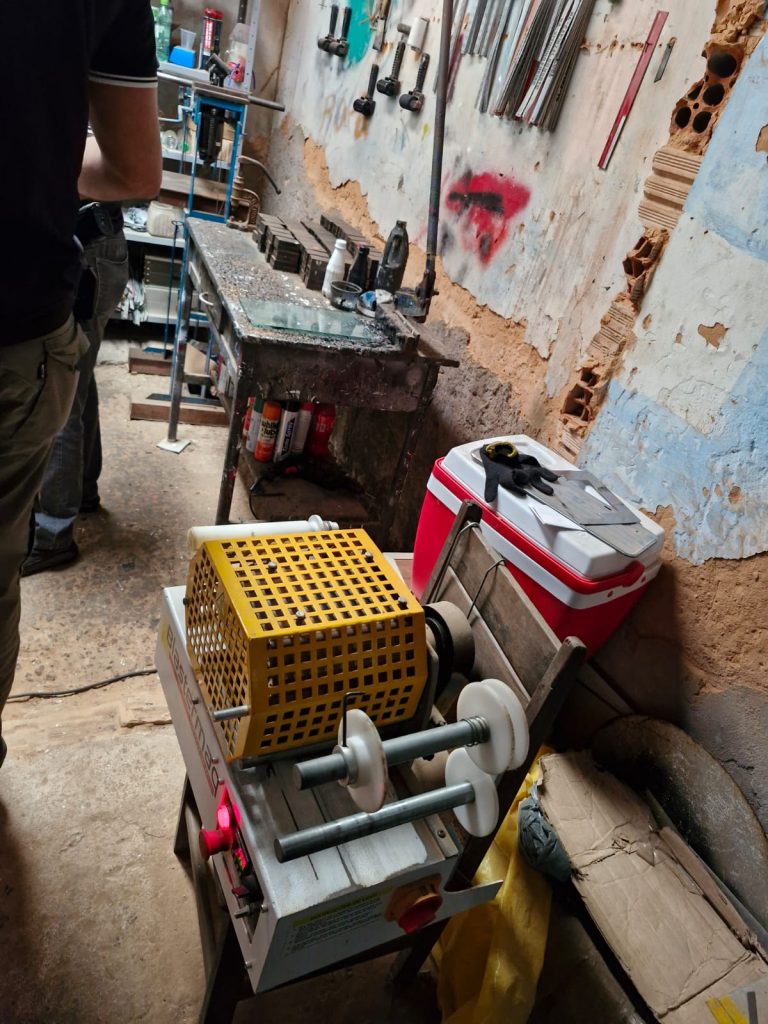 Durante o cumprimento dos mandados de busca, foram apreendidos vários maquinismos, aparelhos, e instrumentos destinados à estampagem de placas em desacordo com regulamentação legal.