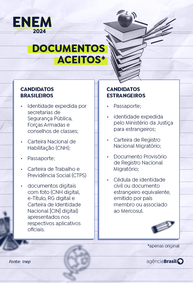 Os participantes brasileiros do Exame Nacional do Ensino Médio (Enem) de 2024 devem levar ao local das provas indicado no Cartão de Confirmação da Inscrição um documento válido com foto para identificação – impressos ou digitais, emitido por órgãos brasileiros, como a carteira de identidade, a Carteira de Trabalho e Previdência Social (CTPS). As provas do Enem 2024 serão realizadas nos dias 3 e 10 de novembro.