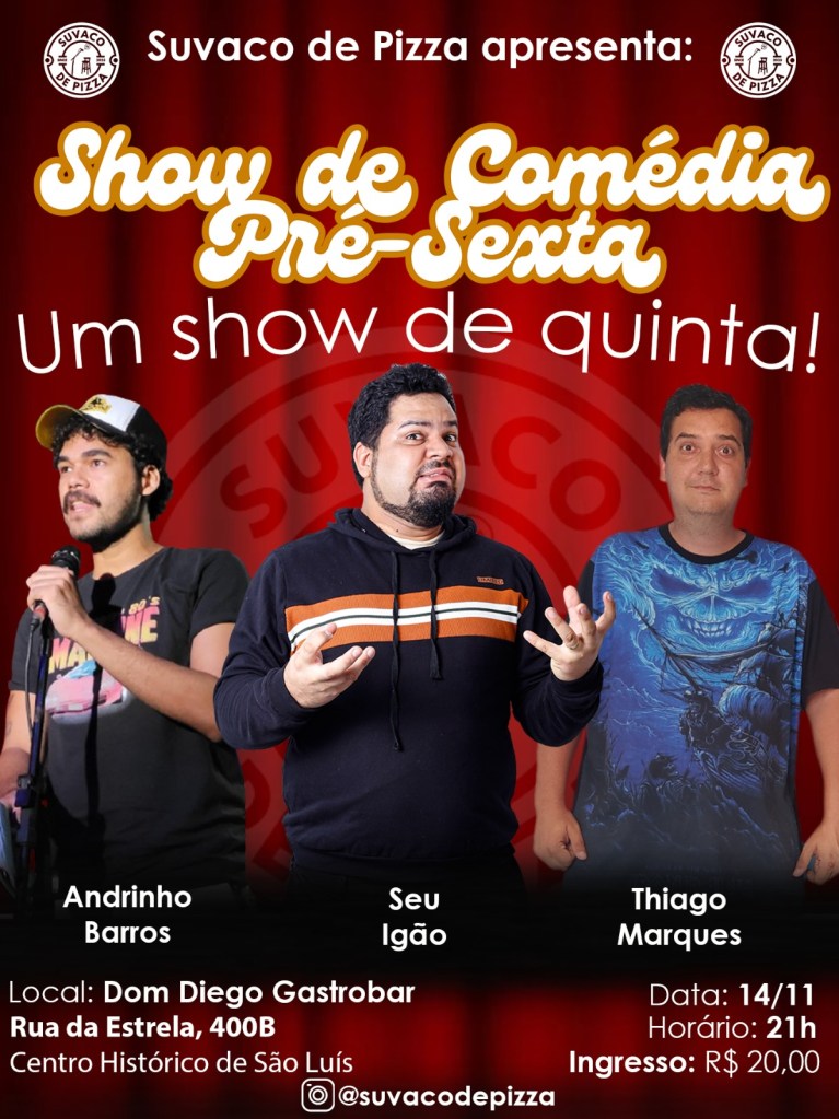 São Luís, prepare-se para uma noite de comédia e diversão! Nesta quinta-feira, dia 14 de novembro, o Dom Diego Gastrobar, situado na charmosa Rua da Estrela, 400B, será o palco do “Show de Comédia Pré-Sexta: Um Show de Quinta”, um evento feito para quem quer começar o fim de semana com boas risadas e energia positiva.