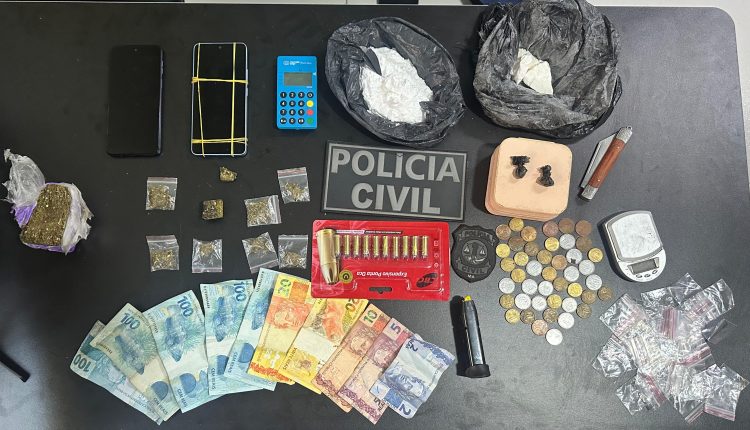 Durante a ação, foram apreendidos grandes volumes de cocaína e maconha prensada, além de apetrechos para o tráfico, como invólucros para embalar a droga, balança de precisão, dinheiro em espécie, munição e um carregador de arma de fogo.
