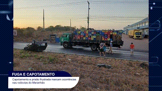 Na BR-135, próximo ao bairro Coqueiro, em São Luís, um veículo Ford/Ka colidiu com a traseira de um caminhão VW/24.220 que saía de um posto de combustível. O impacto fez o automóvel capotar, mas o motorista, que apresentava sinais de embriaguez, sofreu apenas ferimentos leves e foi retirado do local por familiares. O trânsito na região ficou lento até a retirada dos veículos.