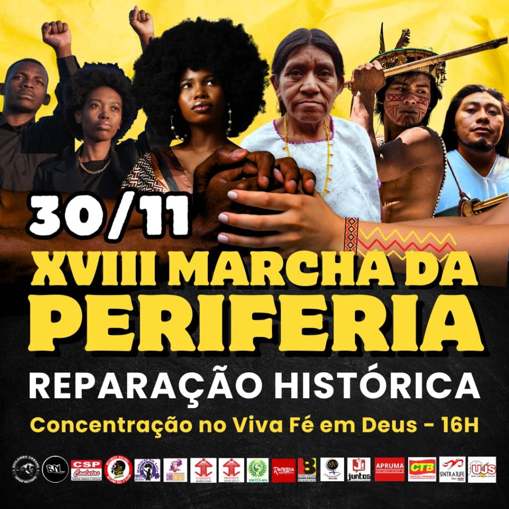 A 18a Marcha da Periferia, edição 2024, acontecerá no Quilombo Liberdade, no próximo sábado, 30 de novembro. Com concentração no Viva da Fé em Deus, às 16h, a Marcha da Periferia 2024 traz como tema Reparação histórica Já! e será finalizada com um Festival de Cultura Afro no Viva Liberdade.
