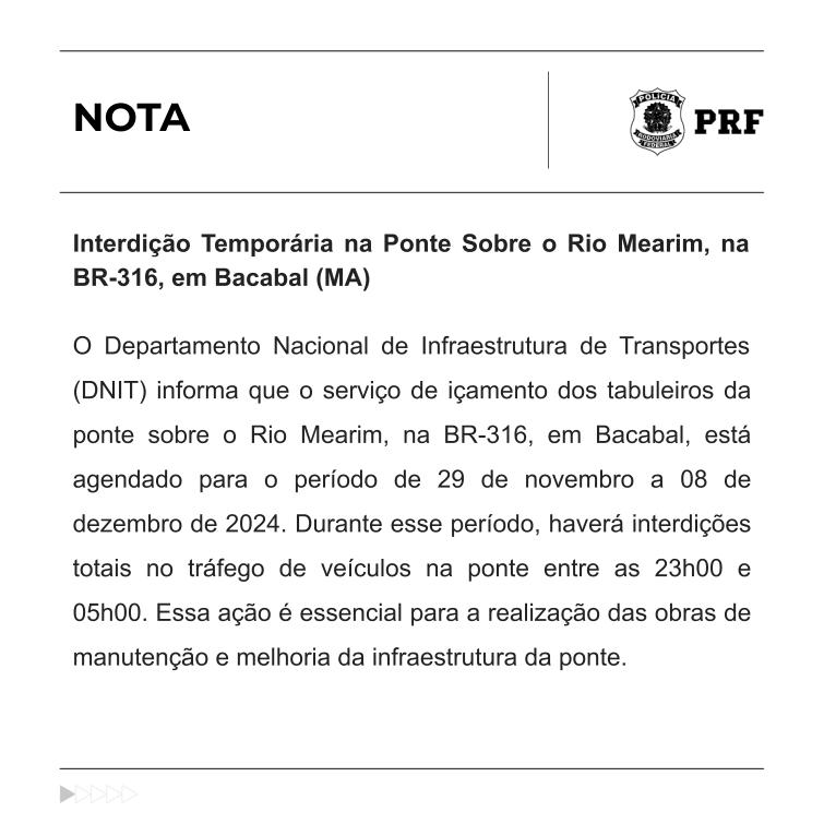 O Departamento Nacional de Infraestrutura de Transportes (DNIT) informou que o içamento dos tabuleiros da ponte sobre o Rio Mearim, na BR-316, em Bacabal, será realizado de 29 de novembro a 8 de dezembro de 2024. Durante esse período, o tráfego de veículos será totalmente interditado na ponte entre 23h e 5h.