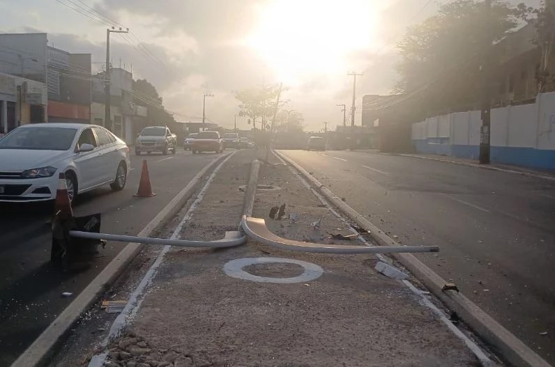 Na madrugada desta sexta-feira (20), um poste de iluminação pública foi derrubado em um acidente na Avenida dos Franceses, no bairro da Alemanha, em São Luís. O motorista de um carro de passeio perdeu o controle do veículo, avançou sobre o canteiro central e colidiu contra o poste, provocando sua queda. Uma placa de sinalização também foi danificada no impacto.