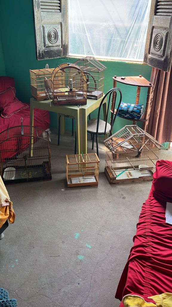No decorrer da operação, os policiais localizaram seis gaiolas com cinco pássaros silvestres – das espécies pipira-preta, pipira-azul e bigode –, que eram mantidos sem autorização ambiental. O responsável pelo imóvel confessou ter capturado os pássaros com arapucas no quintal e afirmou desconhecer a legislação ambiental.