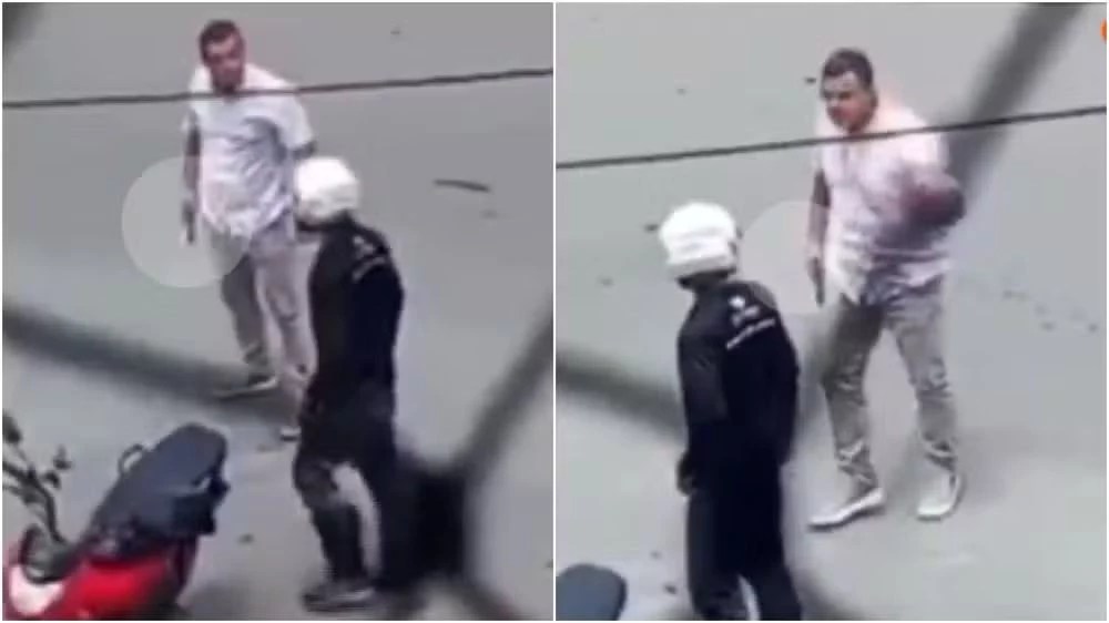 Ainda não se sabe o que motivou a confusão, mas as imagens mostram o momento em que o homem, que estava em uma caminhonete, inicia uma discussão acalorada com o motoqueiro, proferindo agressões verbais. Em seguida, ele derruba o motociclista e, armado, faz ameaças, dizendo frases como: “O que tu vai fazer?” e “Tu tá só maconha”.