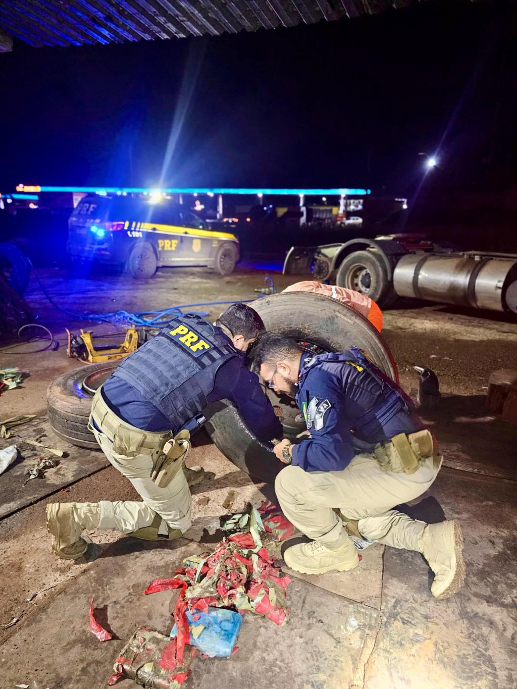 O caminhão foi então levado a uma borracharia da região para uma inspeção mais minuciosa. Após desmontagem das rodas traseiras, os policiais encontraram diversos tabletes de drogas escondidos no interior dos pneus. A carga apreendida totalizou 130,2 kg de skunk (variante mais potente da maconha), 51,3 kg de crack e 7 kg de cloridrato de cocaína, somando 188,5 kg de entorpecentes.
