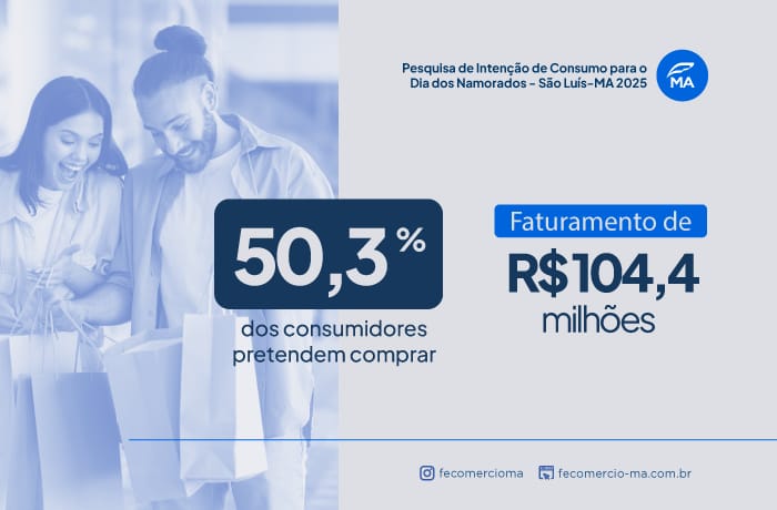 São Luís, 29 de maio de 2025 — O Dia dos Namorados deve impulsionar significativamente o comércio de São Luís neste ano. Segundo a nova Pesquisa de Intenção de Consumo divulgada pela Federação do Comércio de Bens, Serviços e Turismo do Estado do Maranhão (Fecomércio-MA), 50,3% dos consumidores ludovicenses pretendem comprar presentes para a data comemorativa. O índice representa um crescimento expressivo de 10,9 pontos percentuais em relação a 2024, quando apenas 39,4% planejavam comprar algo.