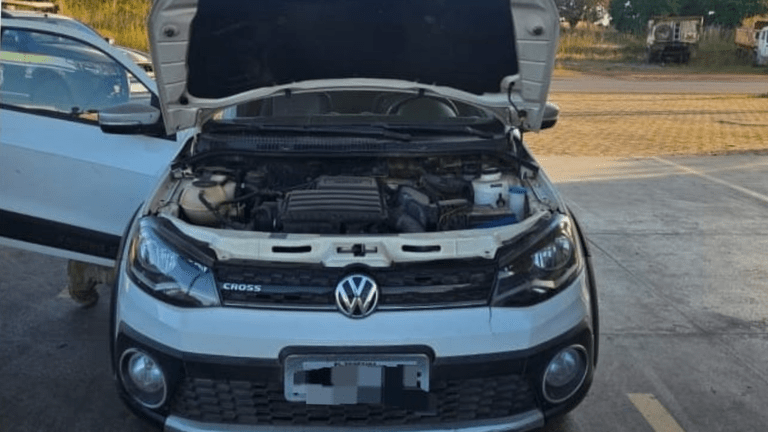 Os policiais abordaram uma VW/Saveiro Cross, de cor branca, e, ao realizar a fiscalização, identificaram sinais de adulteração nos elementos identificadores do veículo. Após consulta aos sistemas, foi constatado que o automóvel havia sido roubado na cidade de Teresina (PI).