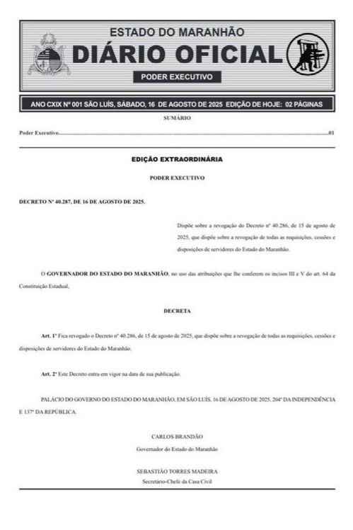 O governador do Maranhão, Carlos Brandão, revogou um decreto que obrigava servidores da administração estadual direta e indireta, atualmente cedidos a outros órgãos e instituições, a retornarem aos seus postos de origem no governo estadual.