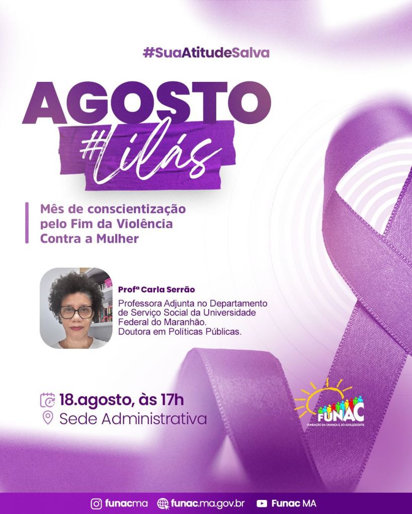 A programação inclui ambientação musical, abertura conduzida pela presidente da Funac, Sorimar Sabóia, exibição dos vídeos “Como você reage à violência contra a mulher” e “Hoje eu recebi flores”, além de palestra da professora e doutora em Políticas Públicas da UFMA, Carla Serrão. O encerramento terá um momento de integração com lanche e troca de experiências.