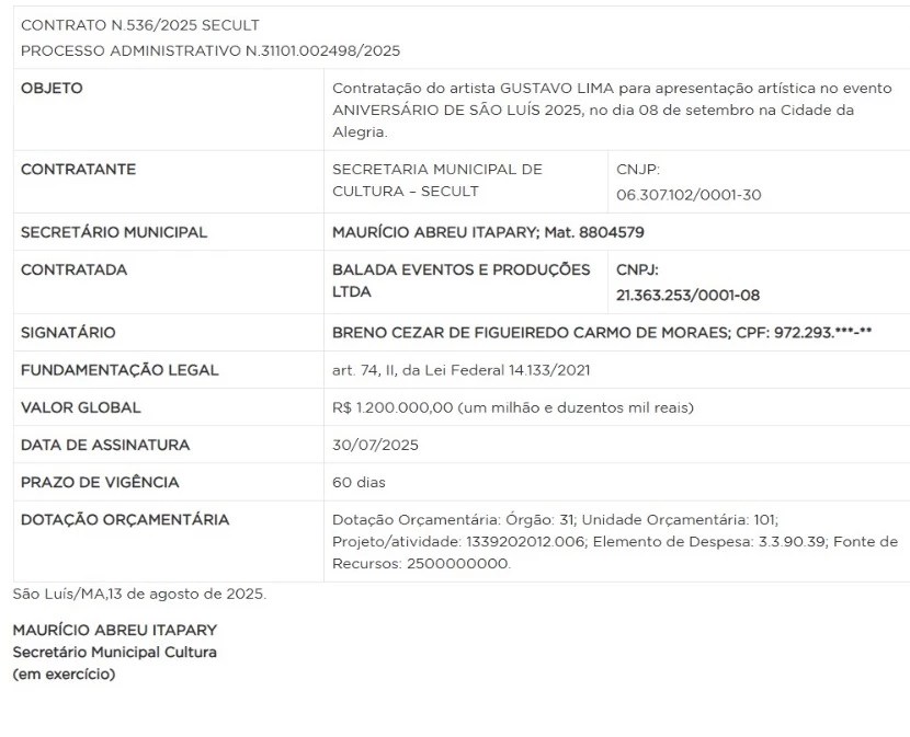 A Prefeitura de São Luís vai desembolsar R\$ 1,2 milhão apenas para a contratação do cantor sertanejo Gusttavo Lima como uma das principais atrações do aniversário de 413 anos da capital maranhense, em 2025. O contrato, firmado pela Secretaria Municipal de Cultura (Secult), foi publicado no Diário Oficial do Município.