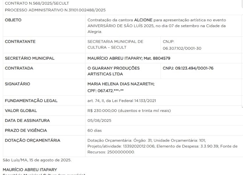 Segundo o documento, os recursos para o pagamento do cachê milionário sairão da dotação orçamentária da Cultura. A apresentação de Gusttavo Lima está marcada para o dia 8 de setembro, dentro do evento Cidade da Alegria, parte da programação oficial de aniversário.