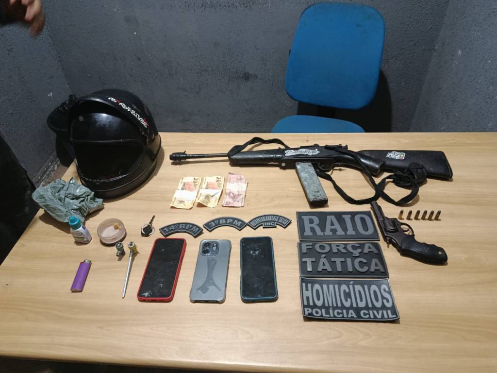 No primeiro local, dois homens foram presos após tentarem se esconder em uma residência. Com eles, os policiais encontraram uma arma de fogo e munições. Já no segundo endereço, onde estariam os demais envolvidos, os agentes apreenderam uma espingarda caseira, duas pedras de crack, dois cachimbos e a motocicleta utilizada no ataque.