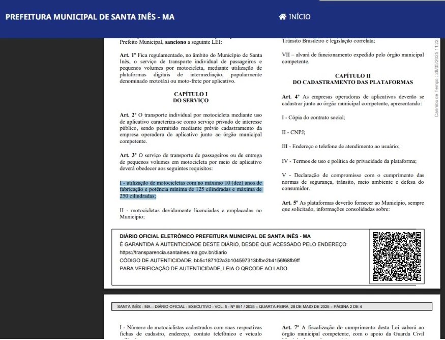 A nova lei municipal de Santa Inês estabelece regras mais rígidas para o serviço de transporte por aplicativo e entrega realizado por motociclistas. A legislação, publicada no Diário Oficial do Município, determina que apenas motos com até 10 anos de fabricação e cilindrada entre 125 e 250 cilindradas poderão ser utilizadas.