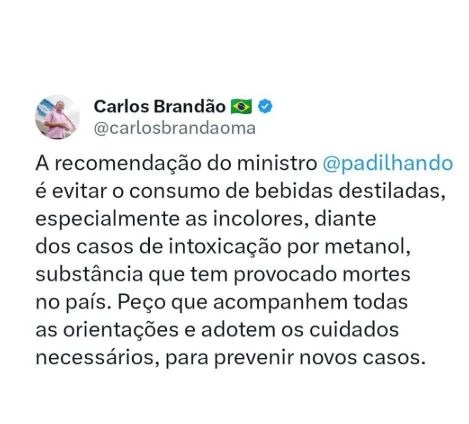 O comunicado ocorreu após o ministro da Saúde, Alexandre Padilha, divulgar que o Brasil já registra 59 notificações relacionadas à intoxicação por metanol, sendo 11 confirmadas em laboratório. A maioria dos casos foi registrada em São Paulo (53), além de cinco em Pernambuco e um no Distrito Federal. No Maranhão, até o momento, não há ocorrências.