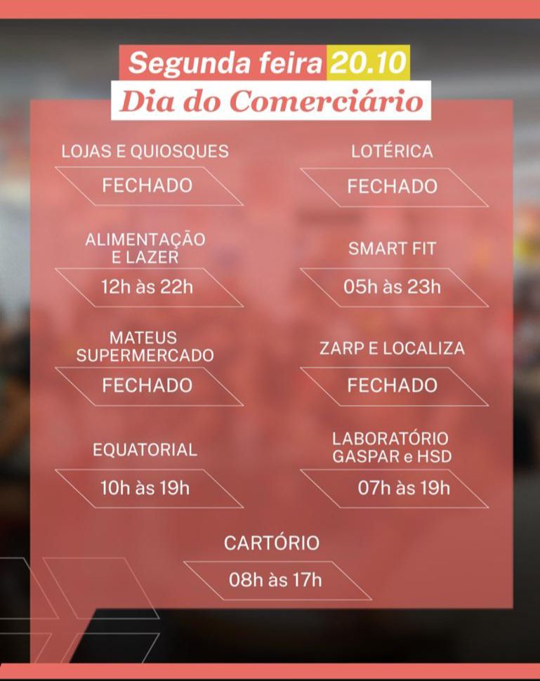 O comércio de São Luís e dos municípios da Região Metropolitana — Paço do Lumiar, Raposa e São José de Ribamar — terá funcionamento modificado nesta segunda-feira (20), em razão da celebração do Dia do Comerciário.