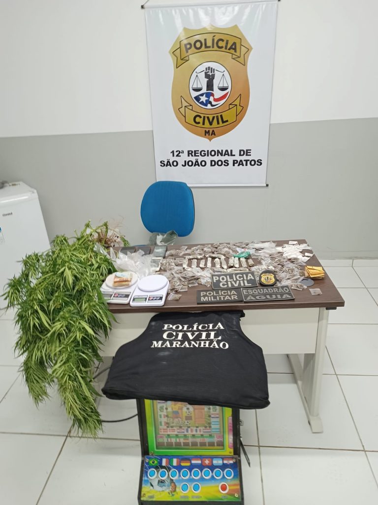 De acordo com informações da 12ª Delegacia Regional de São João dos Patos, durante as buscas no primeiro endereço, os policiais localizaram 196 papelotes de maconha, 17 tabletes da mesma droga, 36 papelotes de cocaína, uma balança de precisão, cinco celulares e R$ 69 em espécie.