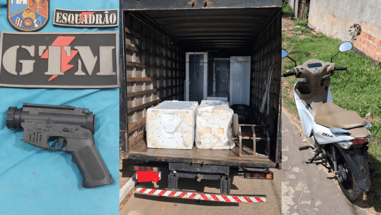 No endereço indicado pelas denúncias, os policiais encontraram um caminhão baú Mercedes-Benz 914; uma motocicleta Honda Biz 125 EX branca, sem placa; quatro geladeiras; duas máquinas de lavar; dois pneus; além da máscara, camisa e do simulacro apreendidos.